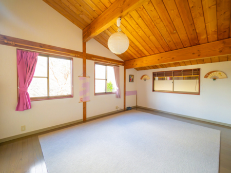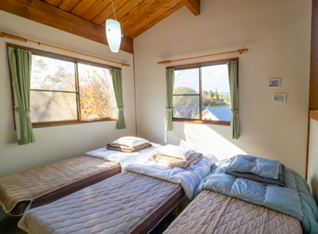 リビング、ダイニング、寝室3部屋を含む2階建ての構造で、ファミリーや大人数のグループに最適な空間を提供します。各部屋は快適な寝具と落ち着いた雰囲気で、リラックスした時間を過ごせます。
